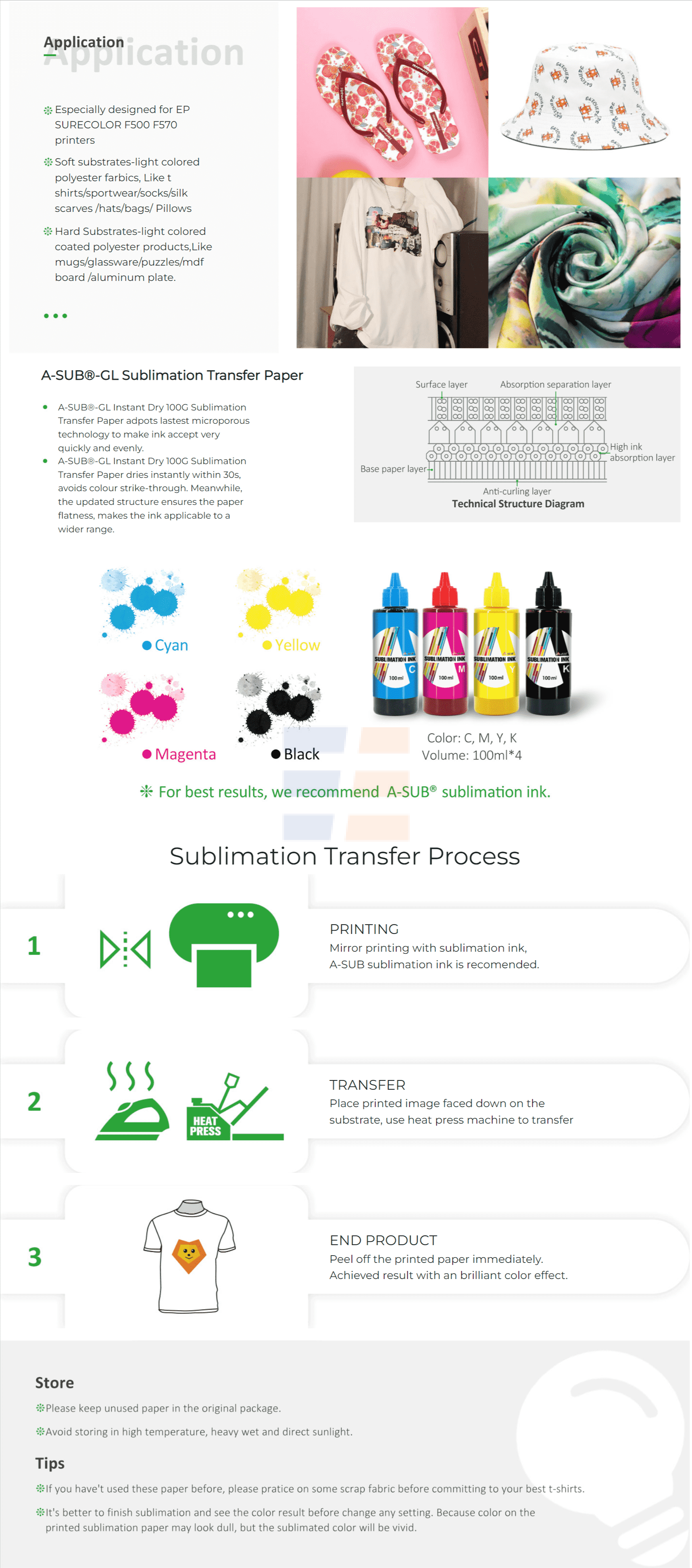 A-SUB®-GL Instant Dry 100G Sublimation Transfer Paper adopts latest microporous technology. It's extremely fast drying which can speed up your batch production.